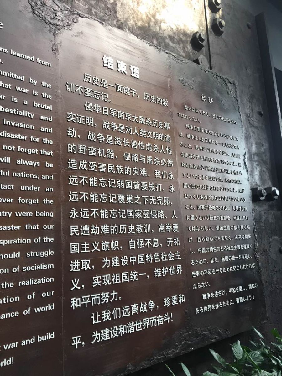 同学们神情凝重地走进南京大屠杀纪念馆,按照讲解和指示开始了参观。看到那些触目惊心的记录照片和影像资料,阅读着饱含无奈与悲愤的文字资料,听到幸存者声泪俱下的控诉,同学们都十分痛恨日军令人发指的残暴行为,为逝去的同胞感到深深的惋惜。印象最深刻的是“万人坑”遗址,累累白骨无言地讲述着屈辱的历史,揭示着侵华日军犯下的滔天大罪。有些同学甚至不忍再看,悄悄地落泪。面前的这些历史资料让我们明白,落后就要挨打,只有强大起来,才不会辜负前人对我们的期望,才能实现中华民族的伟大的理想!