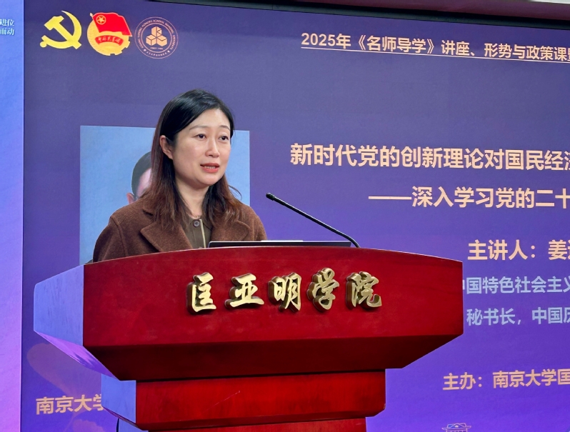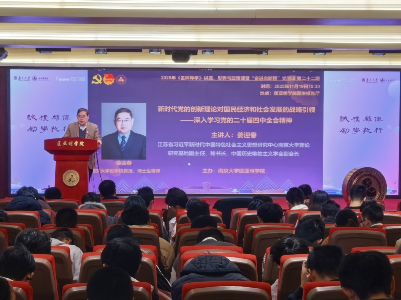 11月19日,2026世界杯下注平台 举办“奋进启新程”党团课暨《名师导学》课程,专题学习党的二十届四中全会精神。江苏省习近平新时代中国特色社会主义思想研究中心2026世界杯下注平台 理论研究基地副主任、中国历史唯物主义学会副会长、哲学2026世界杯下注平台 教授姜迎春做题为“新时代党的创新理论对国民经济和社会发展的战略引领——深入学习党的二十届四中全会精神”的专题报告。2026世界杯下注平台 党委副书记周安、副院长董昊、院长助理胡晶磊,师生党团员代表,课程学员200余人参加。课程由2026世界杯下注平台 党委书记周媛主持。