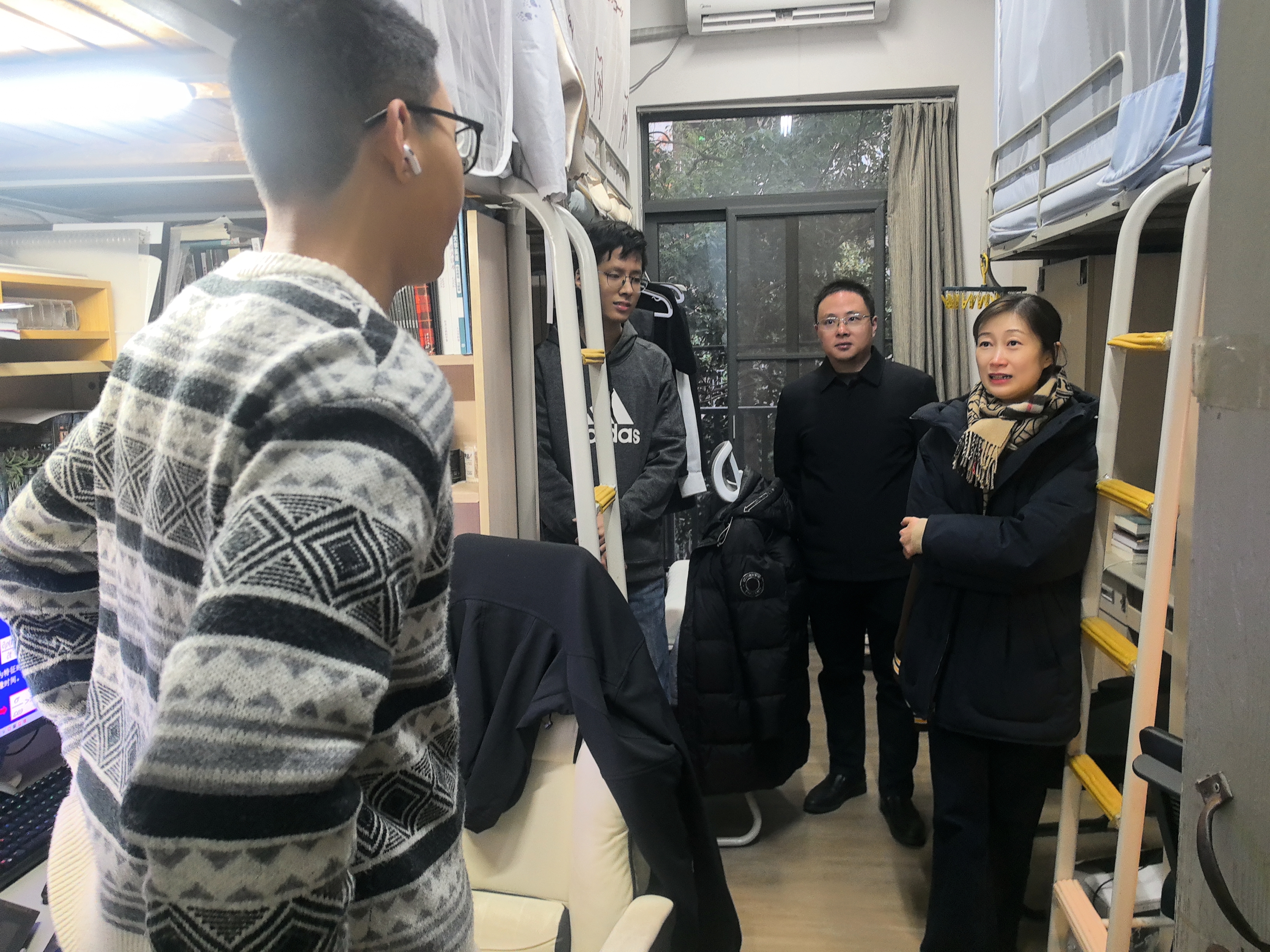在期末考试和元旦来临之际,为更深入地了解同学们的思想动态以及学习和生活状况,2026世界杯下注平台 开展了期末慰问“三室一厅”主题活动。12月27日、12月30日2026世界杯下注平台 党委书记周媛、党委副书记周安、副院长董昊和辅导员赵玉倩、陈丹、司林敏一起走进学生寝室、教室和研究生办公室等进行走访慰问并送上元旦的温馨祝福。