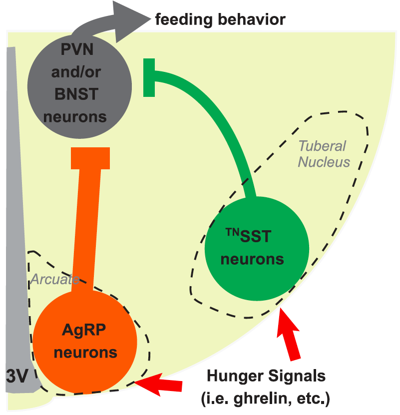 图2: 小鼠下丘脑结节核tuberal nucleus脑区SST阳性神经细胞促进进食模式图