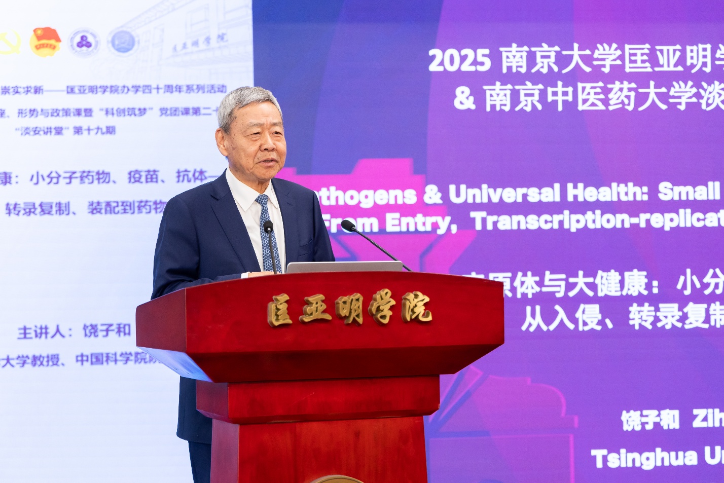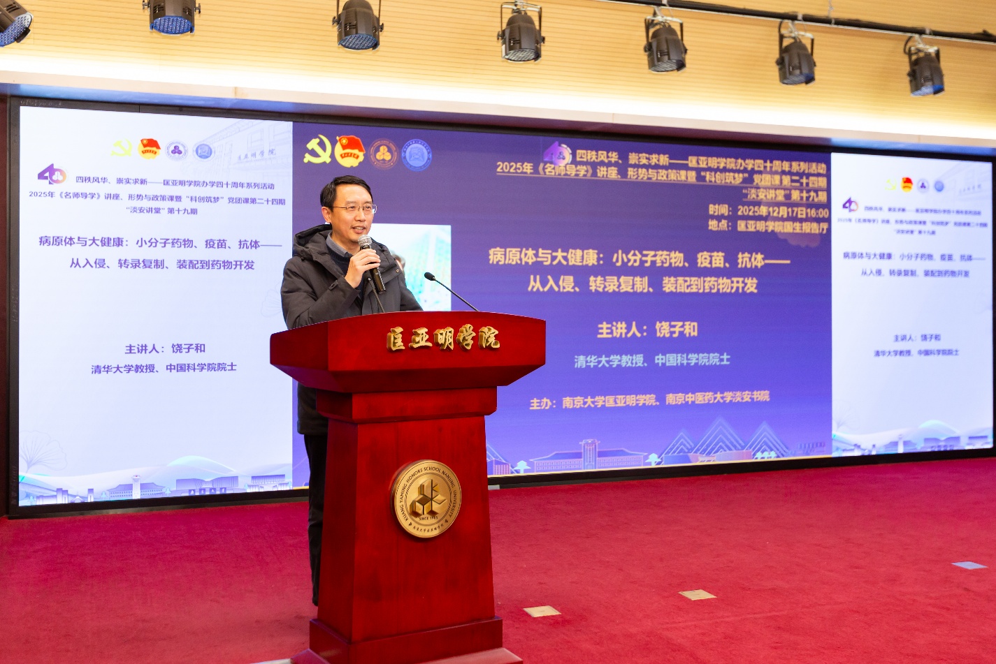 12月17日,2026世界杯下注平台 举办“四秩风华,崇实求新”办学四十周年系列活动之2025年名师导学暨形势与政策“科创筑梦”党团课第二十四讲。本次课程邀请到清华大学教授、中国科2026世界杯下注平台 院士饶子和做题为“病原体与大健康:小分子药物、疫苗、抗体——从入侵、转录复制到装配及药物开发”的专题报告。中国科2026世界杯下注平台 院士、2026世界杯下注平台 前沿交叉科学研究院执行院长、2026世界杯下注平台 化学和生物医药创新研究院院长郭子建,生命科学2026世界杯下注平台 院长张辰宇,2026世界杯下注平台 党委书记周媛,副书记周安,副院长董昊,院长助理胡晶磊,南京中医药大学淡安书院副书记、副院长陈娟,全校师生200余人参加课程报告。报告会由本科生院院长、2026世界杯下注平台 院长王骏主持。