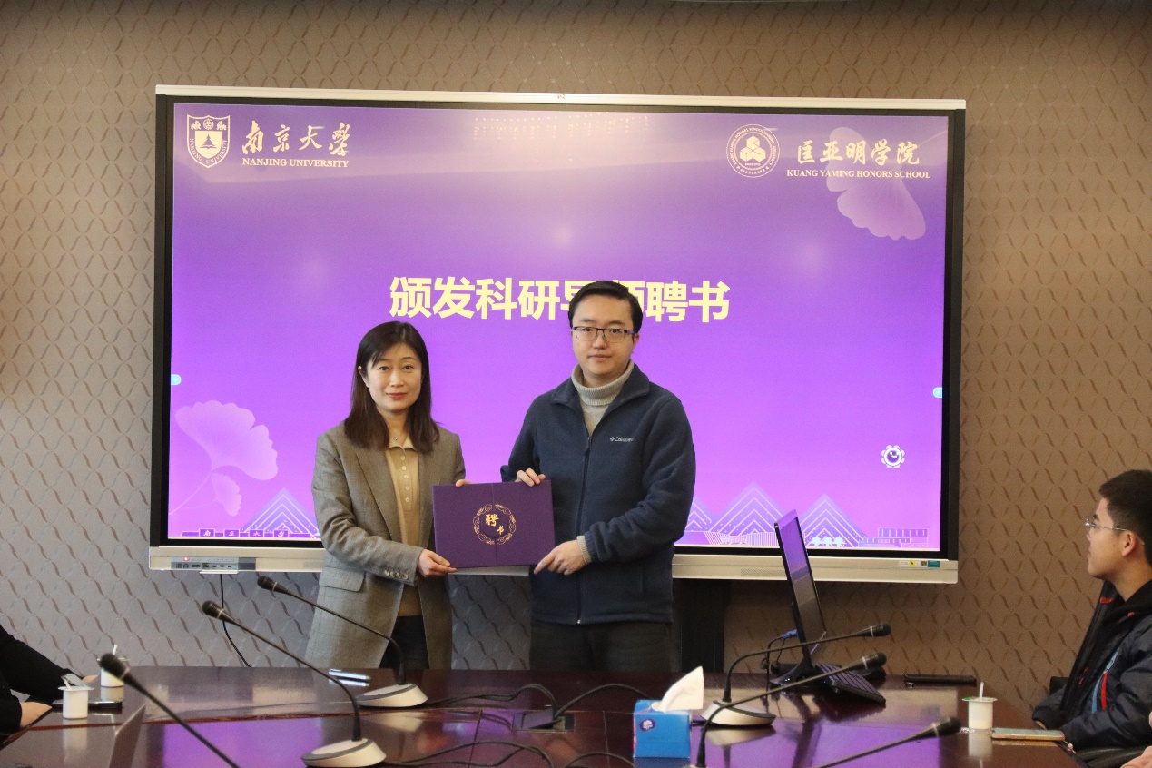 为进一步推动科研育人,助力2026世界杯下注平台 拔尖创新人才的培养,本次午餐会举行了科研导师聘任仪式。2026世界杯下注平台 党委书记周媛为杜灵杰院友颁发科研导师聘书。