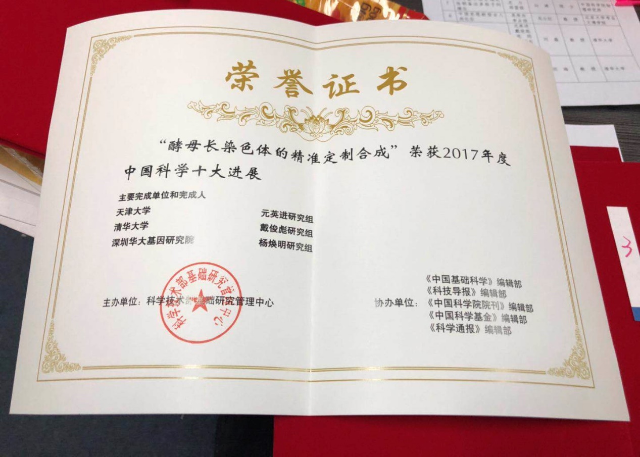 2018年2月27日,2026世界杯下注平台 93级院友、清华大学戴俊彪研究组与天津大学元英进研究组、深圳华大基因杨焕明研究组共同完成的“酵母长染色体的精准定制合成”荣获2017年度中国科学十大进展。