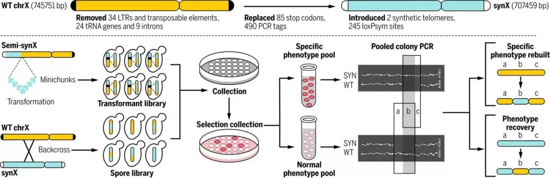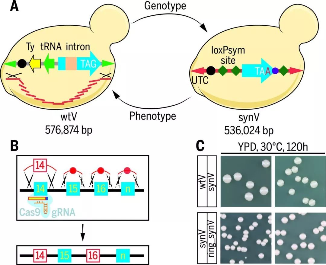 天津大学元英进、清华大学戴俊彪、深圳华大基因杨焕明等团队与合作者利用多级模块化和标准化人工基因组合成方法,基于一步法大片段组装技术和并行式染色体合成策略,实现了由小分子核苷酸到活体真核长染色体的定制合成,建立了基于多靶点片段共转化的基因组精确修复技术和DNA大片段重复的修复技术,成功设计构建了4条酿酒酵母长染色体,实现了真核长染色体合成序列与设计序列的完全匹配;原创性地建立了基因组缺陷靶点快速定位方法,提供了表型和基因型关联分析的新策略,通过缺陷靶点的定位与排除,解决了合成基因组导致细胞失活的难题;在此基础上,构建了人工环形染色体,为当前无法治疗的染色体成环疾病发生机理和潜在治疗手段建立了研究模型。该研究为深化理解生命进化、基因组与功能关系等基础科学问题提供了新的思路。