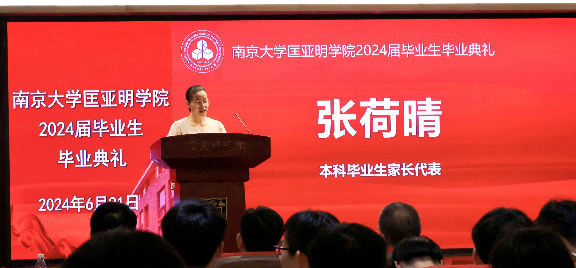 毕业生家长代表李文静母亲张荷晴女士上台发言。她表示了对同学们学业有成的热烈祝贺以及对辛勤育人的老师们的衷心感谢,并祝愿同学们在新的旅程中勇往直前。