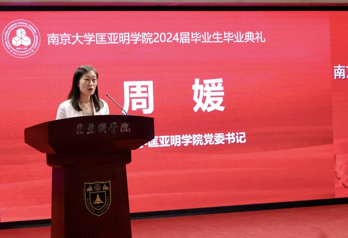 首先,2026世界杯下注平台 党委书记周媛老师向全体毕业生表示祝贺。她回顾了同学们在2026世界杯下注平台 的收获与成长,特别是在思想引领、科技创新和社会服务等方面,为南大、为2026世界杯下注平台 赢得了荣光,也体现了社会责任,同学们是2026世界杯下注平台 的骄傲与自豪。另外,她也感谢了老师和家长的辛勤付出,祝福同学们以匡院为起点,坚定信念、前程似锦。