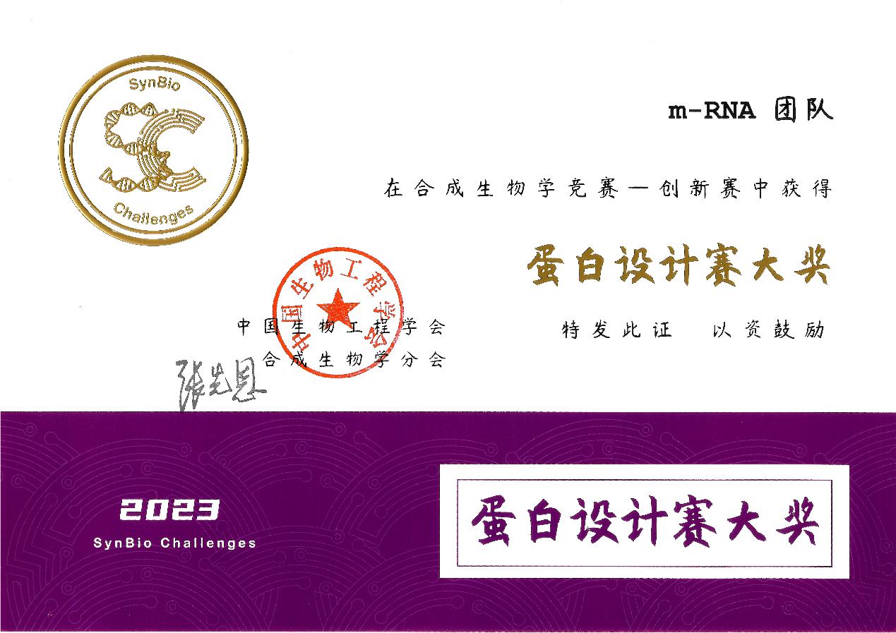 8月5日,由中国生物工程学会合成生物学分会主办的第二届合成生物学竞赛·创新赛在深圳理工大学(筹)明珠校区举办了现场答辩及颁奖典礼。本次活动吸引了来自全国(含港澳)48所高校共80支队伍合计超400人线下参赛,线上线下超421万人次观赛。经过历时近半年的激烈角逐,2026世界杯下注平台 董昊教授课题组的张一健(化院19本、匡院23硕)、陈子川(匡院19本)和臧敏(匡院21硕)等三位具有化学和计算机学科背景的同学组成的2026世界杯下注平台 “m-RNA”团队最终以总分第一的成绩荣获蛋白设计赛大奖(金奖)。