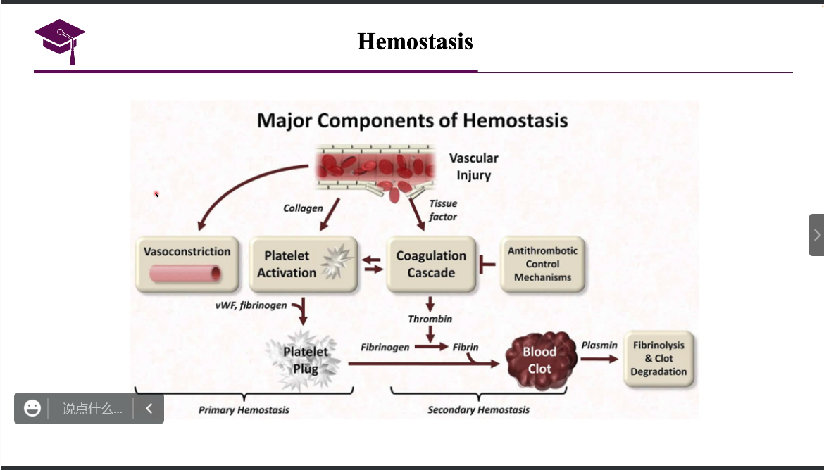 接下来董咸池老师深入介绍了凝血反应相关知识。我们首先要对基本的血液循环系统有一个大致的了解——它由血管系统和心脏构成。而其中流动的血液又主要由红细胞、白细胞、血小板构成,其中血小板在凝血反应中发挥了巨大的作用。凝血反应的过程主要有四步:血管收缩、血小板激活与级联(初级凝血和二级凝血)、血块收缩、血栓溶解。